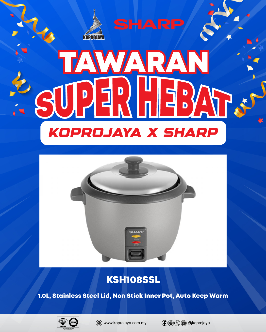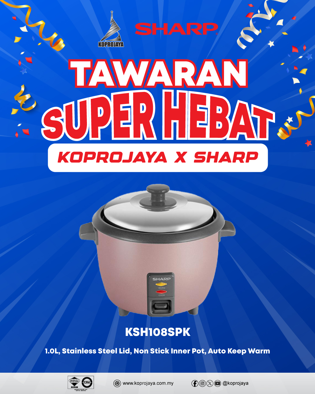 2 KSH108SSL 129.00 99.00 89.10 1.0L, Stainless Steel Lid, Non Stick Inner Pot, Auto Keep Warm