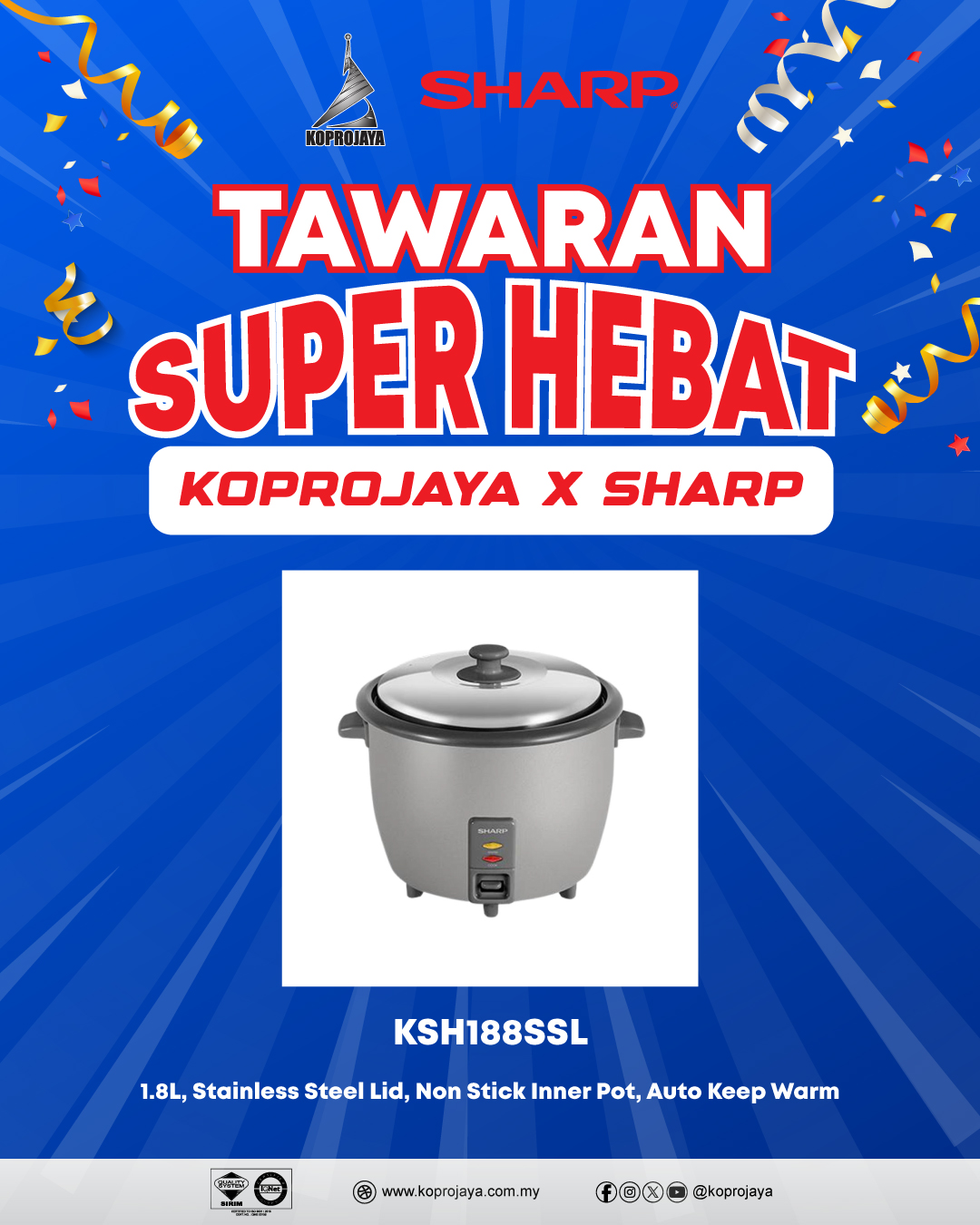 5 KSH188SSL 149.00 119.00 107.10 1.8L, Stainless Steel Lid, Non Stick Inner Pot, Auto Keep Warm