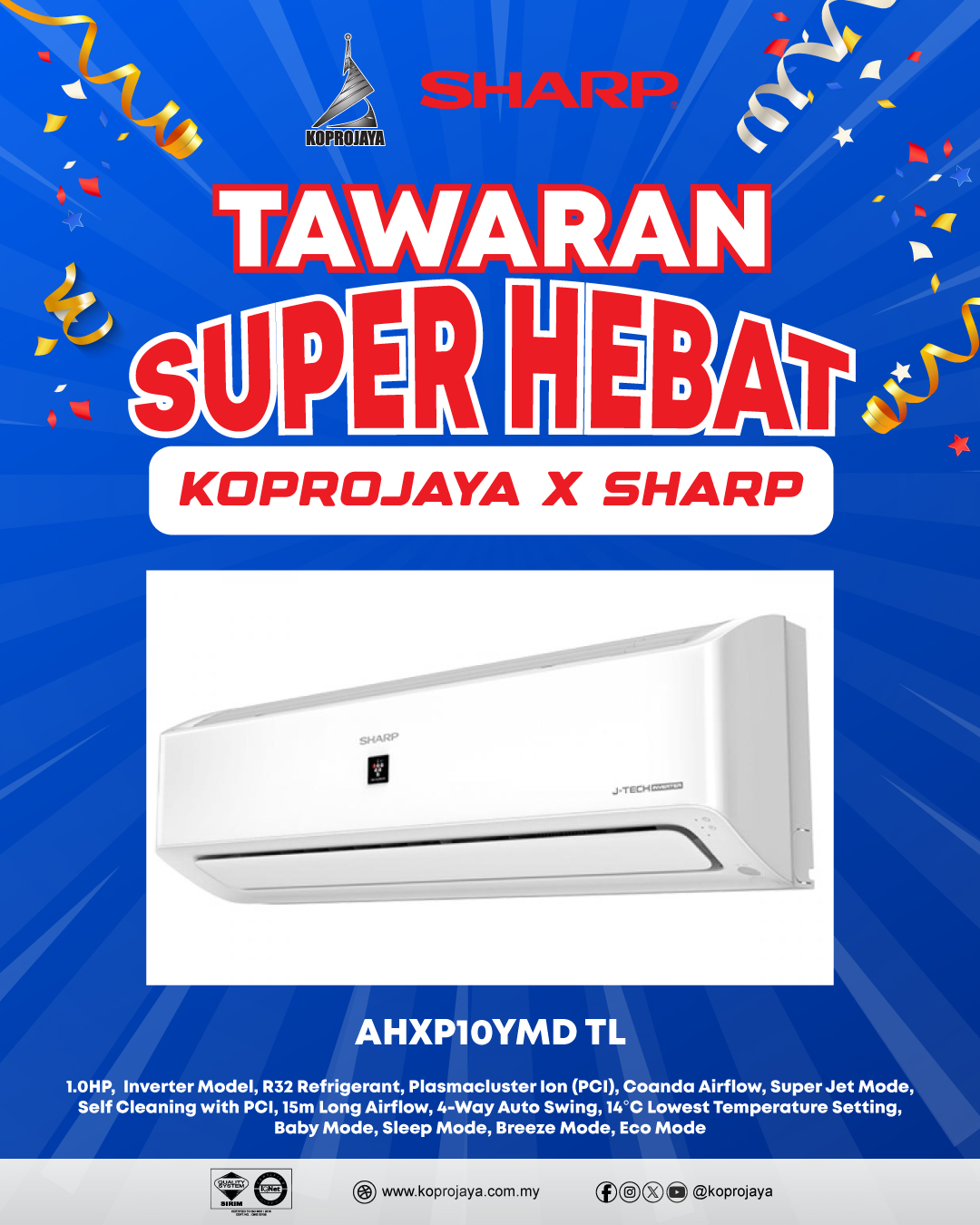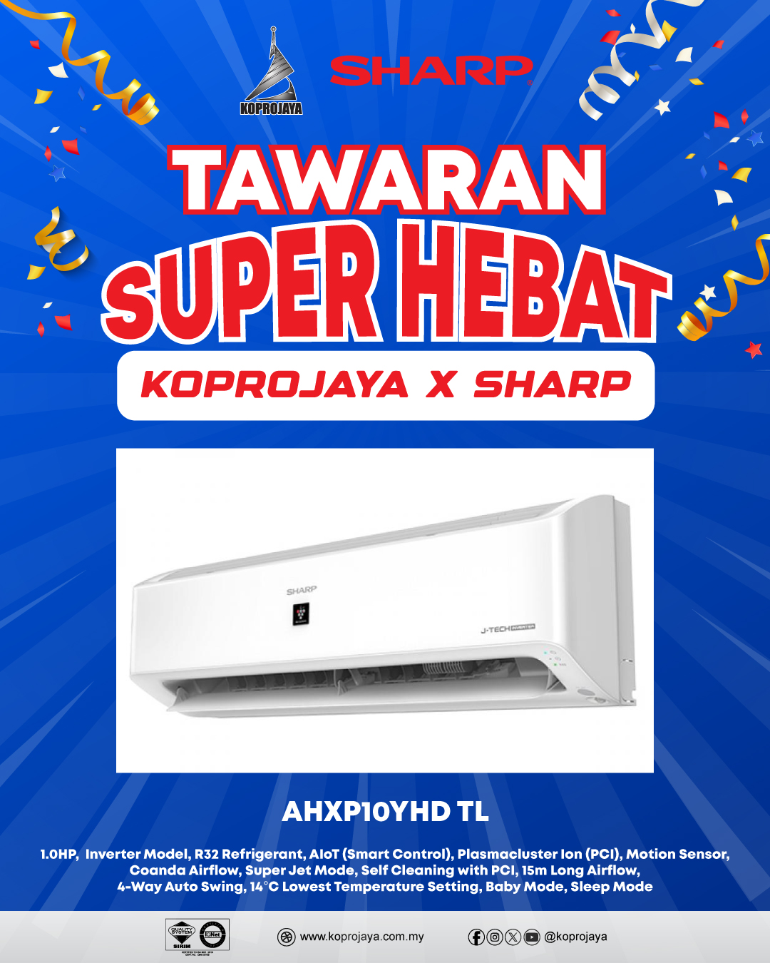 30 AHXP10YHD TL 2,649.00 1,989.00 1,790.10 1.0HP, Inverter Model, R32 Refrigerant, AIoT (Smart Control), Plasmacluster Ion (PCI), Motion Sensor, Coanda Airflow, Super Jet Mode, Self Cleaning with PCI, 15m Long Airflow, 4-Way Auto Swing, 14°C Lowest Temperature Setting, Baby Mode, Sleep Mode