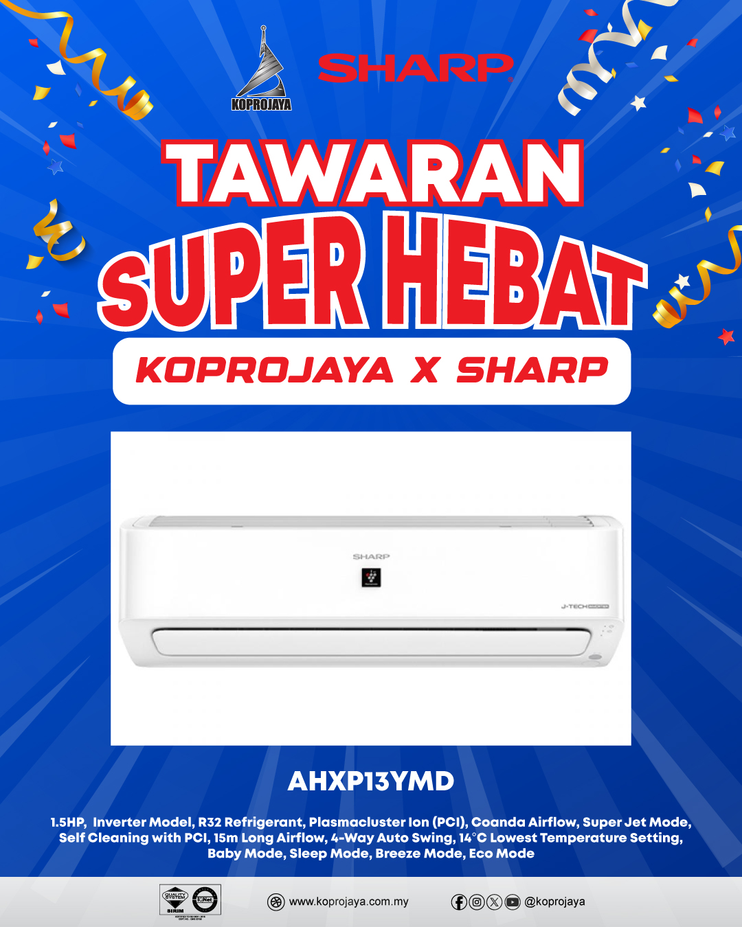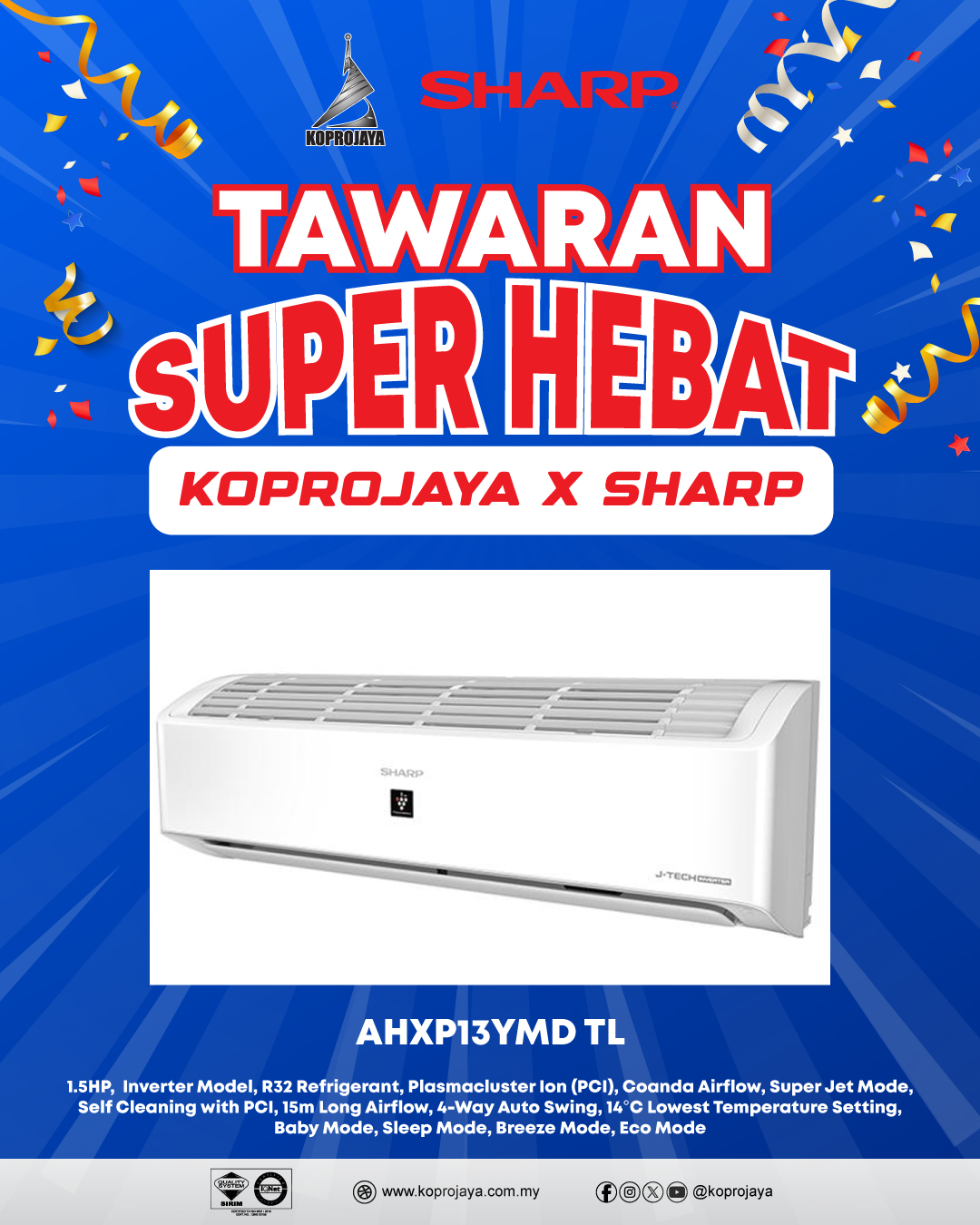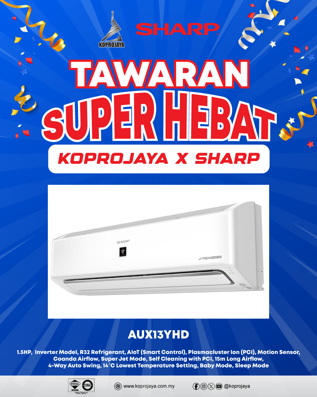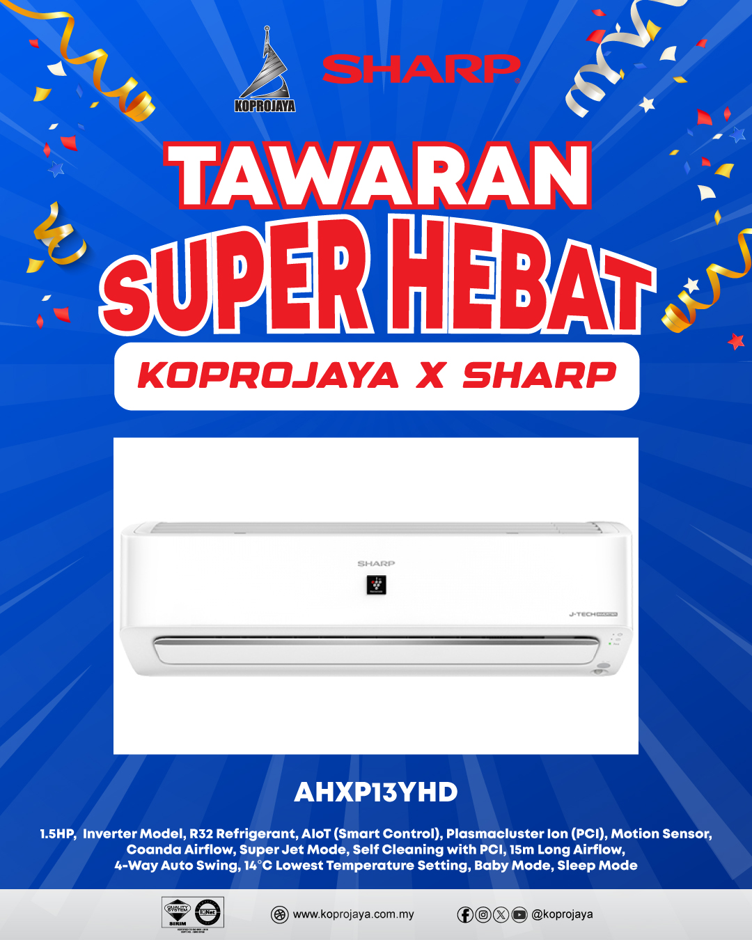 31 AHXP13YHD 2,909.00 909.00 818.10 1.5HP, Inverter Model, R32 Refrigerant, AIoT (Smart Control), Plasmacluster Ion (PCI), Motion Sensor, Coanda Airflow, Super Jet Mode, Self Cleaning with PCI, 15m Long Airflow, 4-Way Auto Swing, 14°C Lowest Temperature Setting, Baby Mode, Sleep Mode