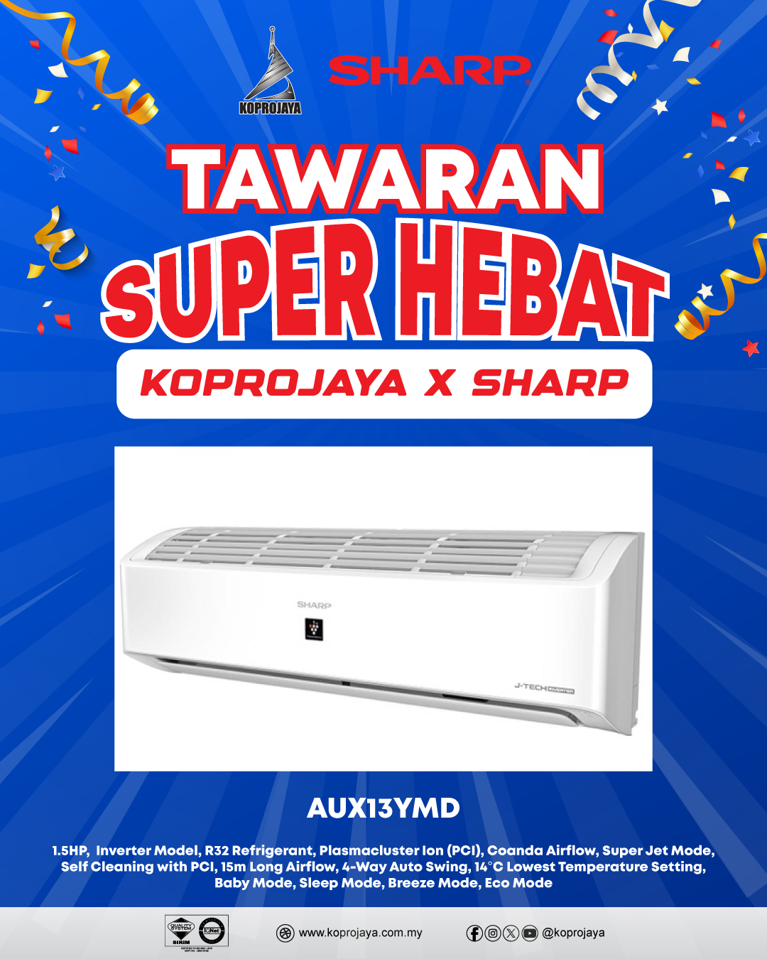 32 AUX13YHD 2,909.00 1,359.00 1,223.10 1.5HP, Inverter Model, R32 Refrigerant, AIoT (Smart Control), Plasmacluster Ion (PCI), Motion Sensor, Coanda Airflow, Super Jet Mode, Self Cleaning with PCI, 15m Long Airflow, 4-Way Auto Swing, 14°C Lowest Temperature Setting, Baby Mode, Sleep Mode