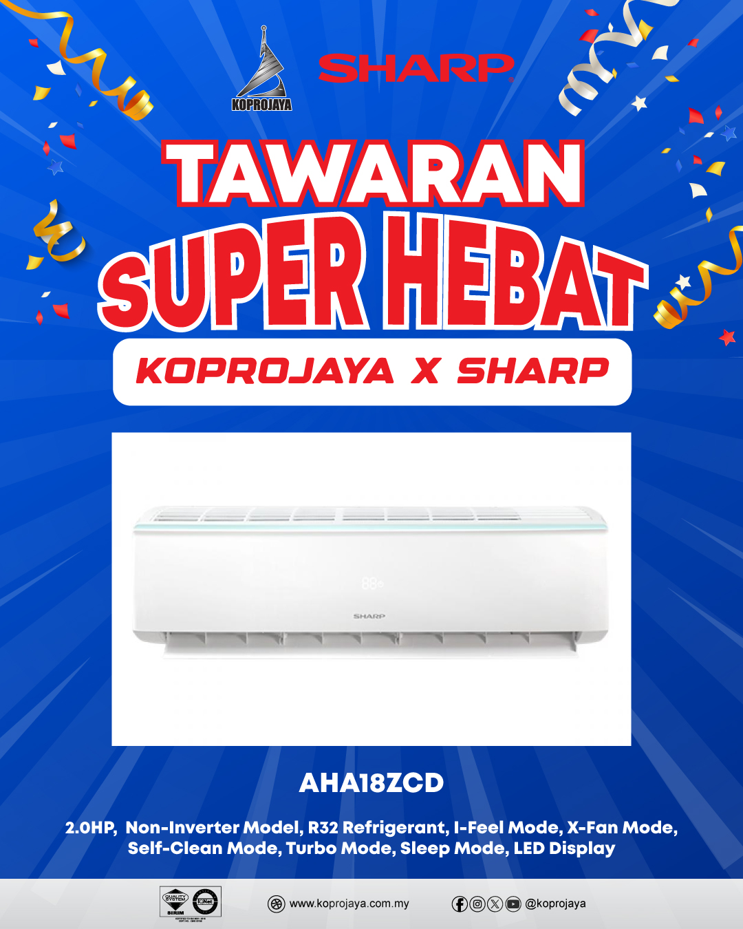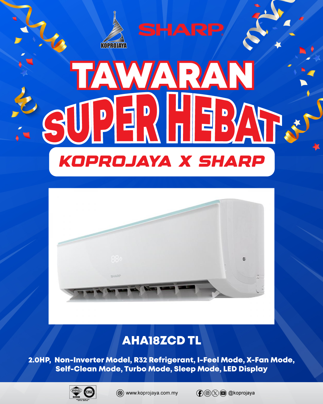 22 AHA18ZCD 2,899.00 769.00 692.10 2.0HP, Non-Inverter Model, R32 Refrigerant, I-Feel Mode, X-Fan Mode, Self-Clean Mode, Turbo Mode, Sleep Mode, LED Display