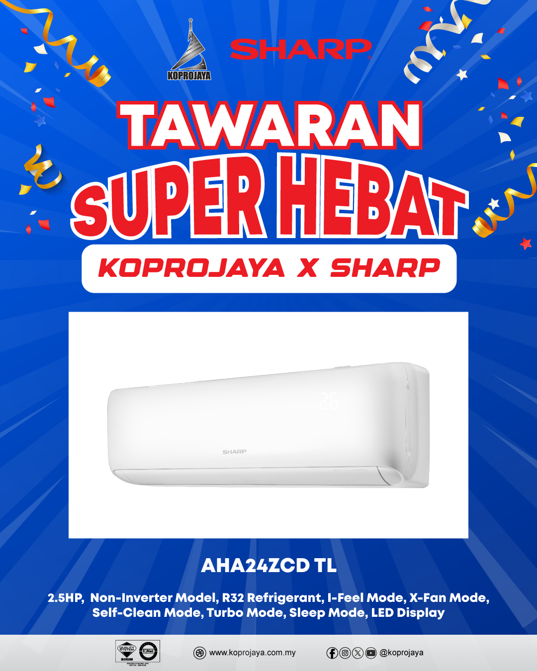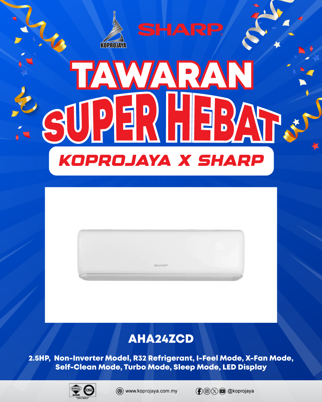 25 AHA24ZCD 3,599.00 1,019.00 917.10 2.5HP, Non-Inverter Model, R32 Refrigerant, I-Feel Mode, X-Fan Mode, Self-Clean Mode, Turbo Mode, Sleep Mode, LED Display