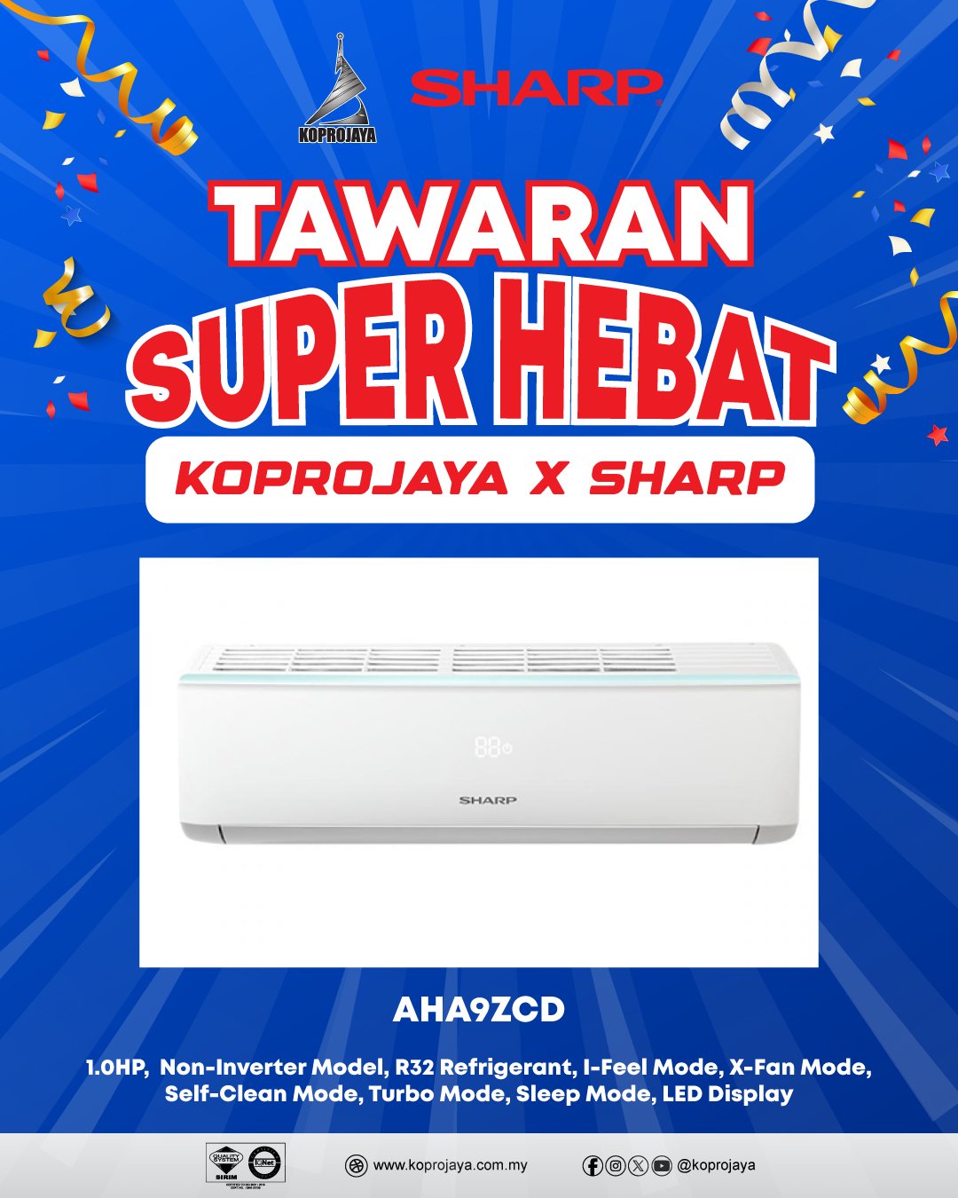 16 AHA9ZCD 1,509.00 439.00 395.10 1.0HP, Non-Inverter Model, R32 Refrigerant, I-Feel Mode, X-Fan Mode, Self-Clean Mode, Turbo Mode, Sleep Mode, LED Display