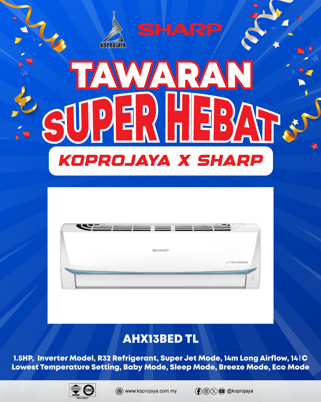 10 AHX13BED 2,399.00 739.00 665.10 1.5HP, Inverter Model, R32 Refrigerant, Super Jet Mode, 14m Long Airflow, 14°C Lowest Temperature Setting, Baby Mode, Sleep Mode, Breeze Mode, Eco Mode