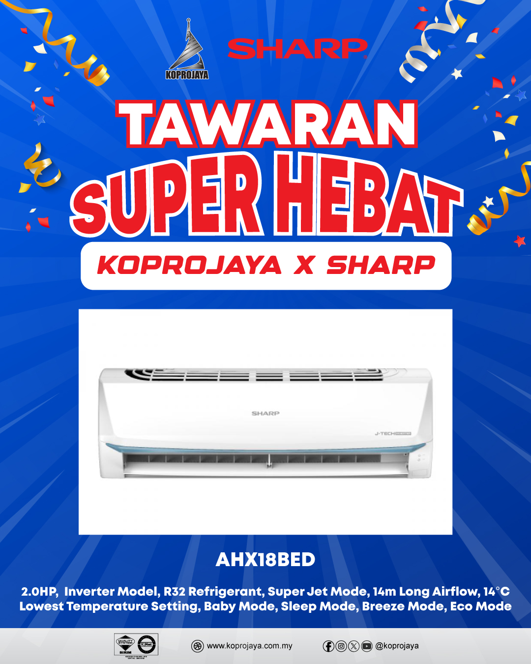 13 AHX18BED 3,499.00 999.00 899.10 2.0HP, Inverter Model, R32 Refrigerant, Super Jet Mode, 14m Long Airflow, 14°C Lowest Temperature Setting, Baby Mode, Sleep Mode, Breeze Mode, Eco Mode