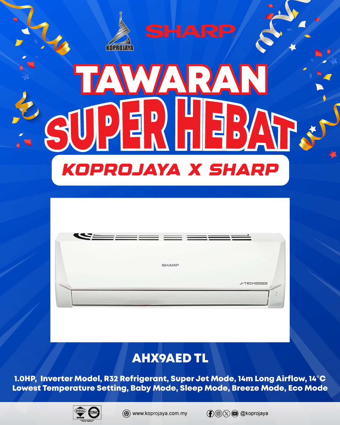 3 AHX9AED TL 1,999.00 1,749.00 1,574.10 1.0HP, Inverter Model, R32 Refrigerant, Super Jet Mode, 14m Long Airflow, 14°C Lowest Temperature Setting, Baby Mode, Sleep Mode, Breeze Mode, Eco Mode