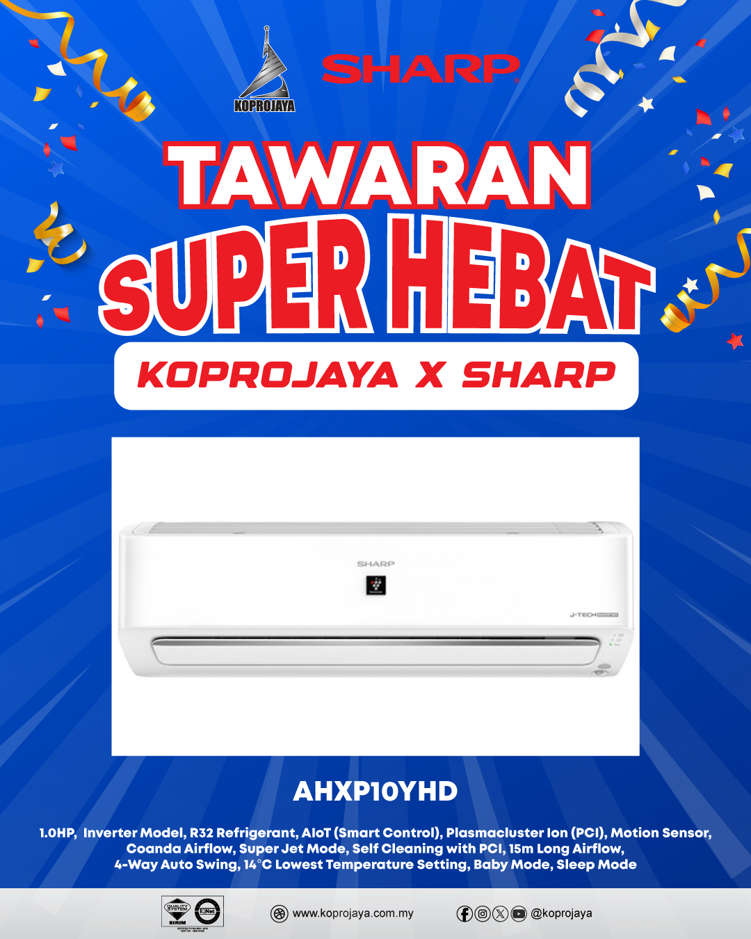 28 AHXP10YHD 2,649.00 799.00 719.10 1.0HP, Inverter Model, R32 Refrigerant, AIoT (Smart Control), Plasmacluster Ion (PCI), Motion Sensor, Coanda Airflow, Super Jet Mode, Self Cleaning with PCI, 15m Long Airflow, 4-Way Auto Swing, 14°C Lowest Temperature Setting, Baby Mode, Sleep Mode