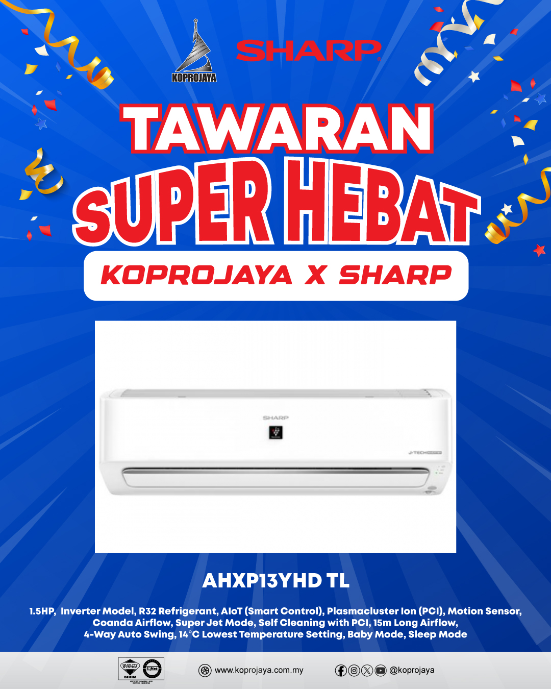 33 AHXP13YHD TL 2,909.00 2,259.00 2,033.10 1.5HP, Inverter Model, R32 Refrigerant, AIoT (Smart Control), Plasmacluster Ion (PCI), Motion Sensor, Coanda Airflow, Super Jet Mode, Self Cleaning with PCI, 15m Long Airflow, 4-Way Auto Swing, 14°C Lowest Temperature Setting, Baby Mode, Sleep Mode