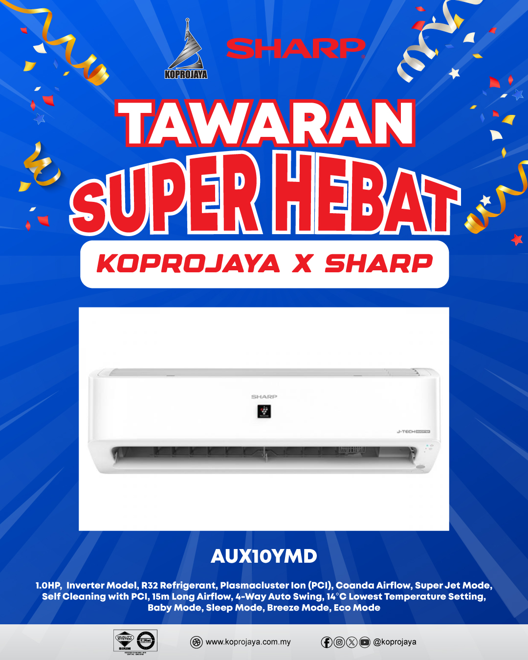 29 AUX10YHD 2,649.00 1,199.00 1,079.10 1.0HP, Inverter Model, R32 Refrigerant, AIoT (Smart Control), Plasmacluster Ion (PCI), Motion Sensor, Coanda Airflow, Super Jet Mode, Self Cleaning with PCI, 15m Long Airflow, 4-Way Auto Swing, 14°C Lowest Temperature Setting, Baby Mode, Sleep Mode