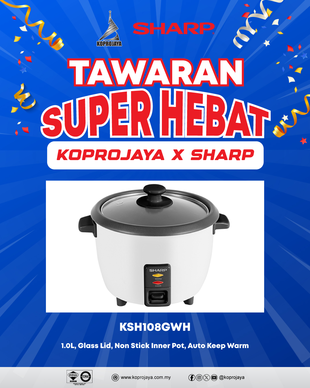 3 KSH108GWH 139.00 99.00 89.10 1.0L, Glass Lid, Non Stick Inner Pot, Auto Keep Warm