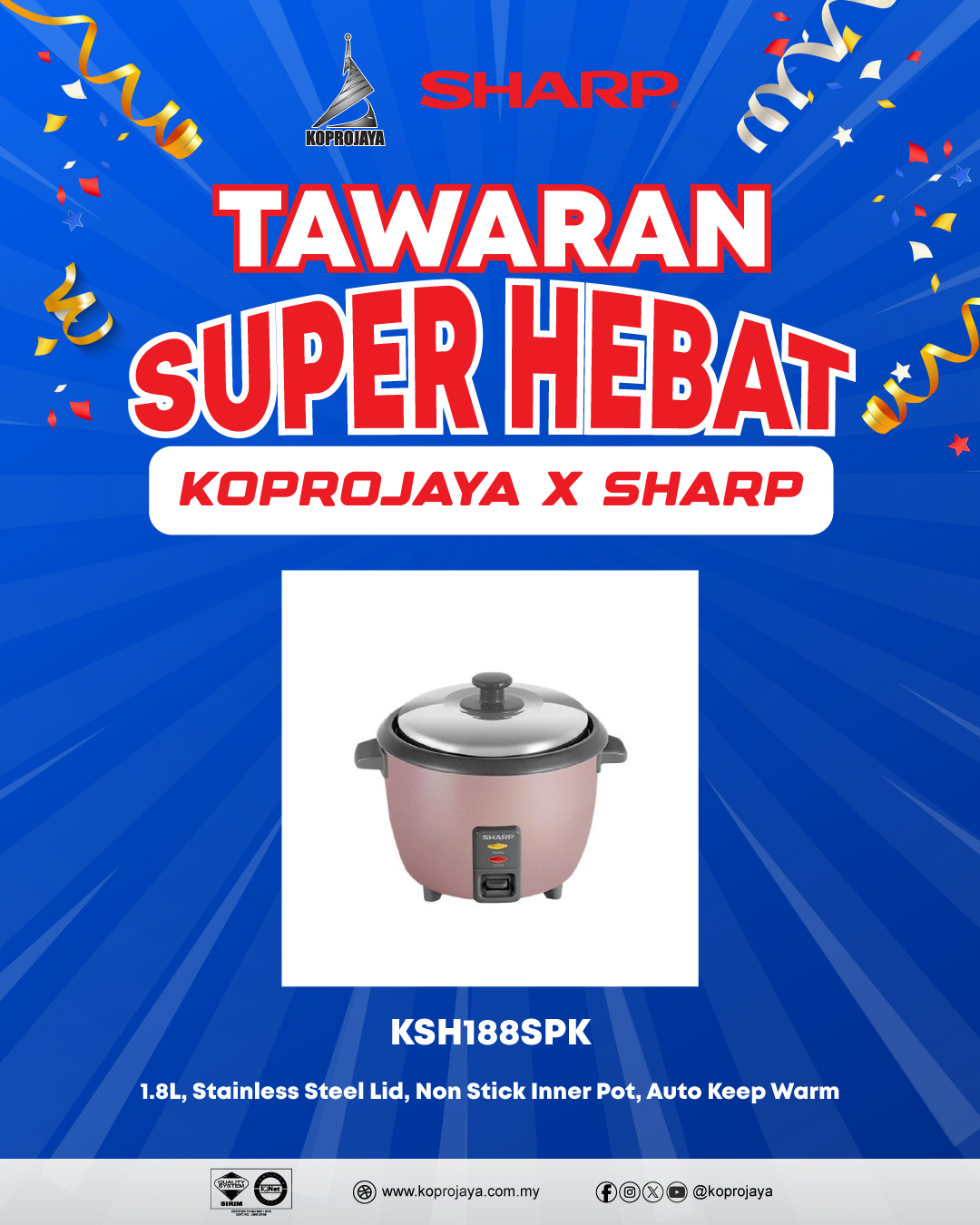 5 KSH188SSL 149.00 119.00 107.10 1.8L, Stainless Steel Lid, Non Stick Inner Pot, Auto Keep Warm