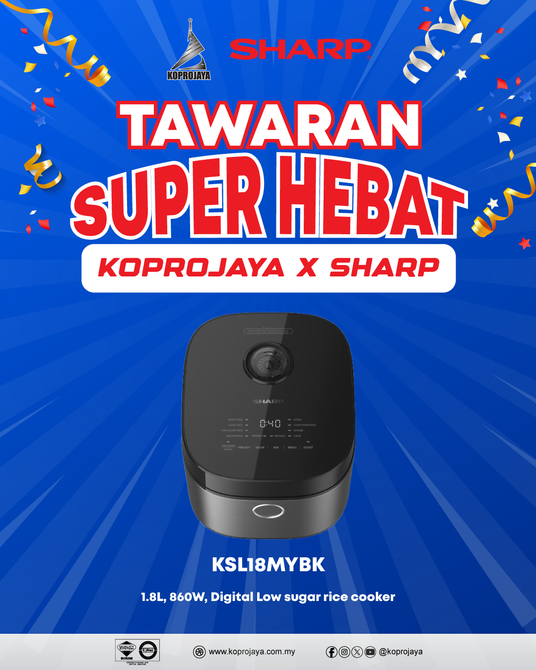 6 KSL18MYBK 619.00 409.00 368.10 1.8L, 860W, Digital Low sugar rice cooker